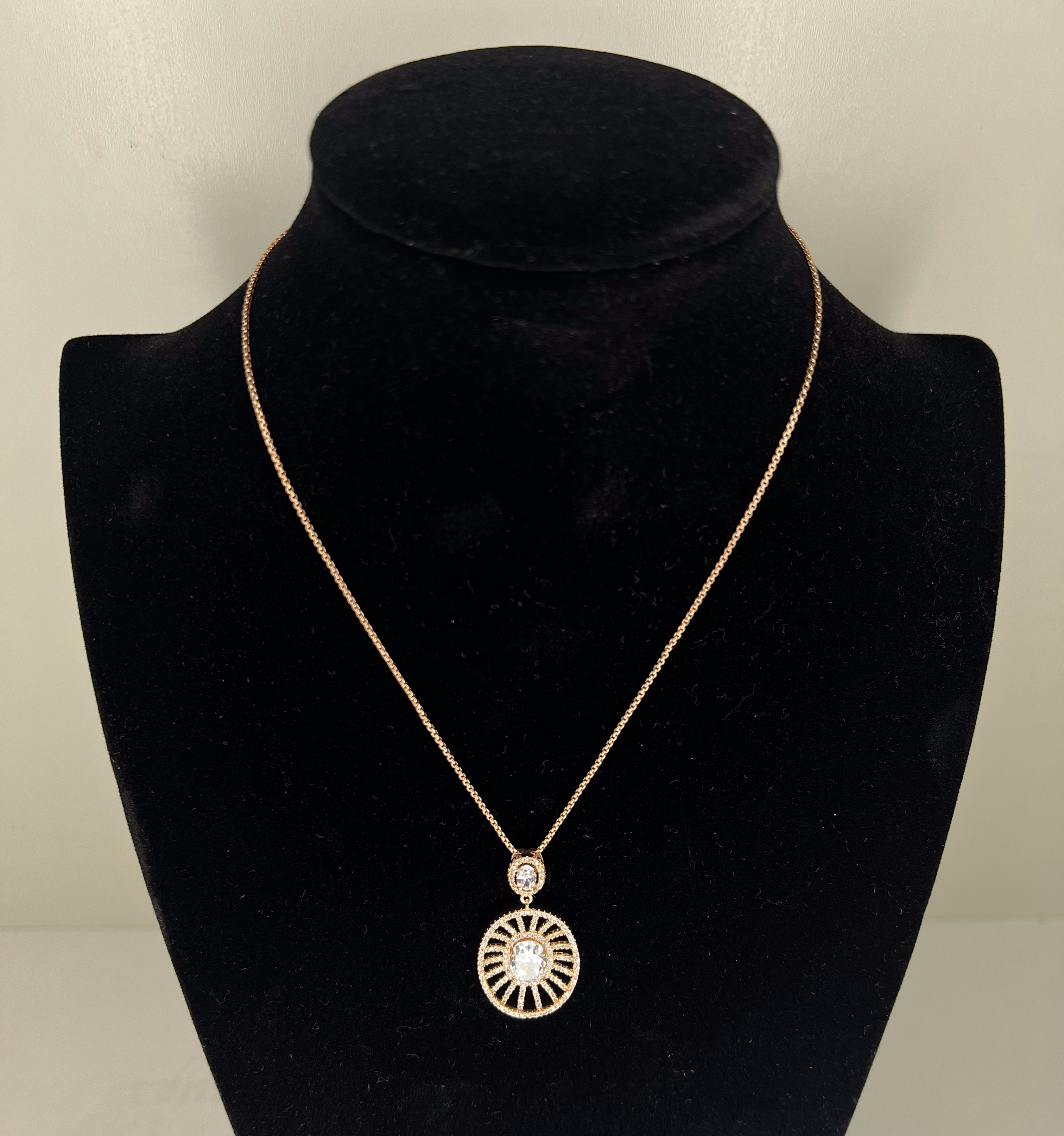 Colar dourado; Aço inoxidável; Duas esferas em zircónias e brilhantes.