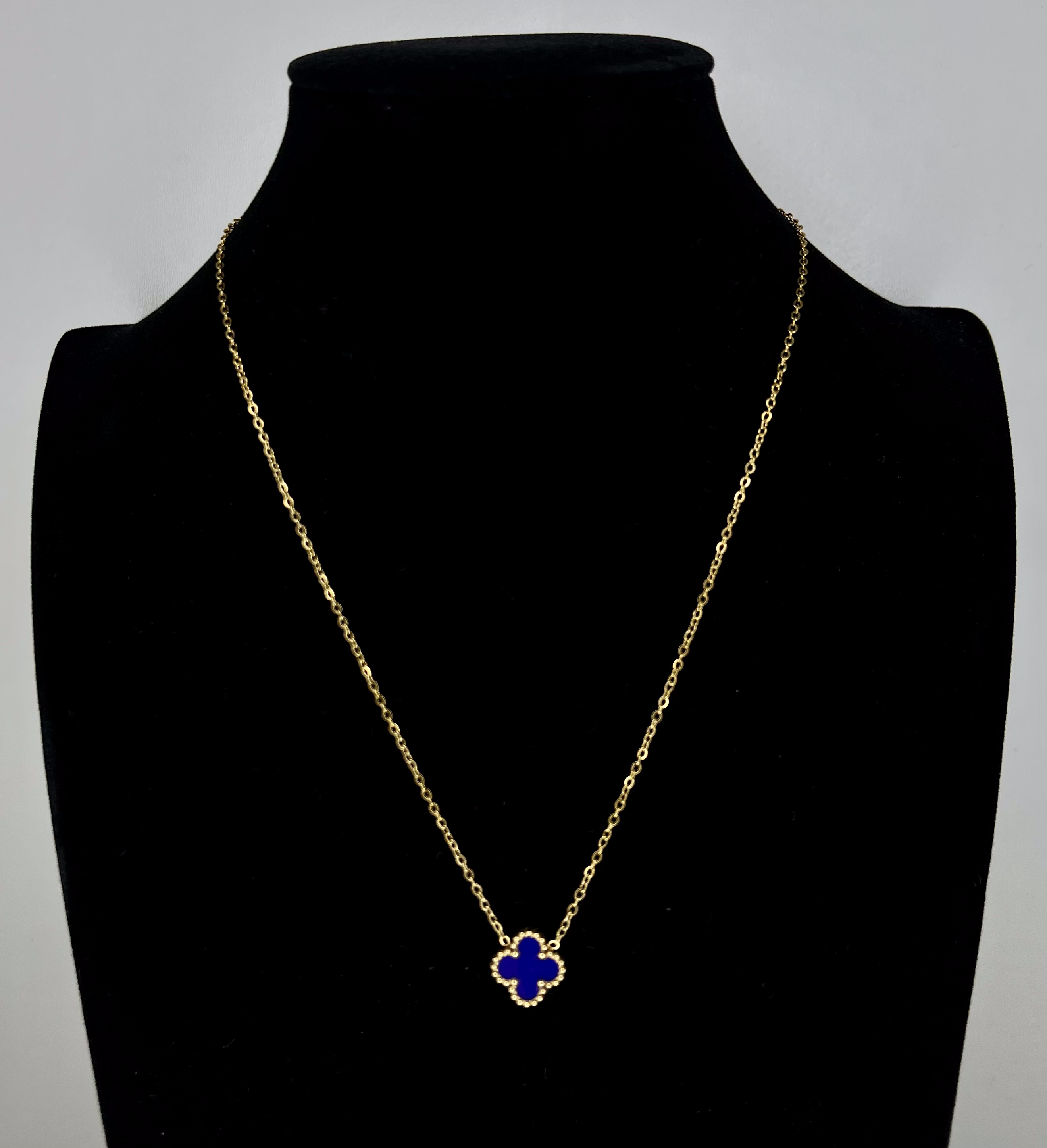 Colar dourado; Aço inoxidável; Flor azul.