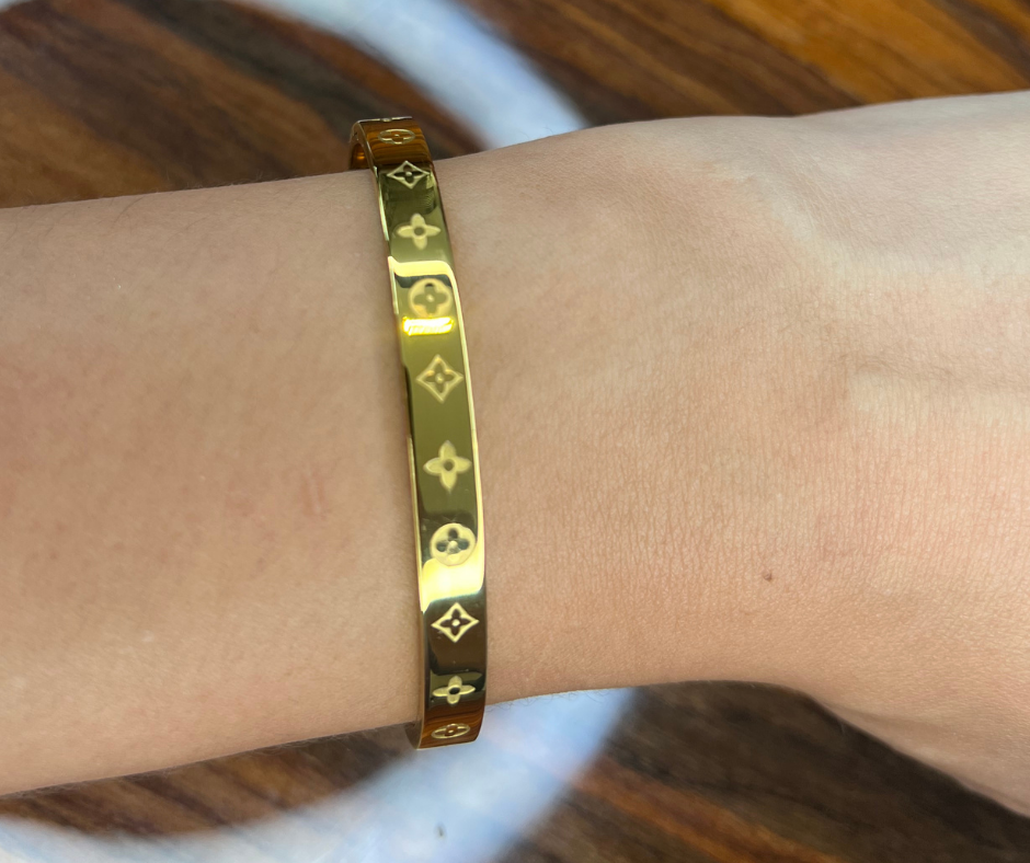 Pulseira dourada; Aço inoxidável; Trabalhada flores.