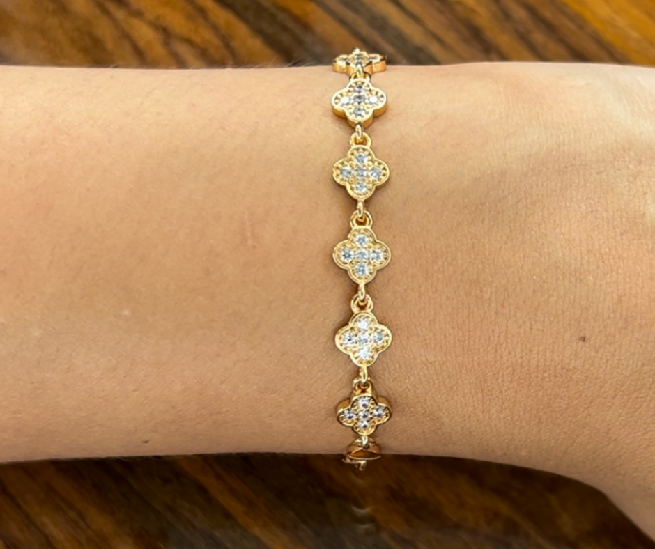 Pulseira dourada; Aço inoxidável; Flores com zircónias incrustadas.